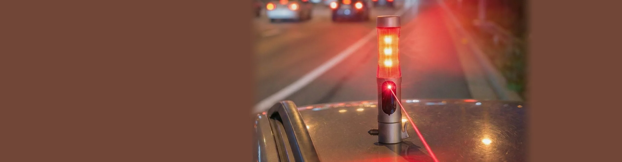1 Led blanche + 9 lumières rouges clignotantes sur le côté, coupe-ceinture, brise-vitre, socle aimanté.
